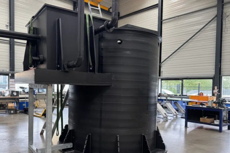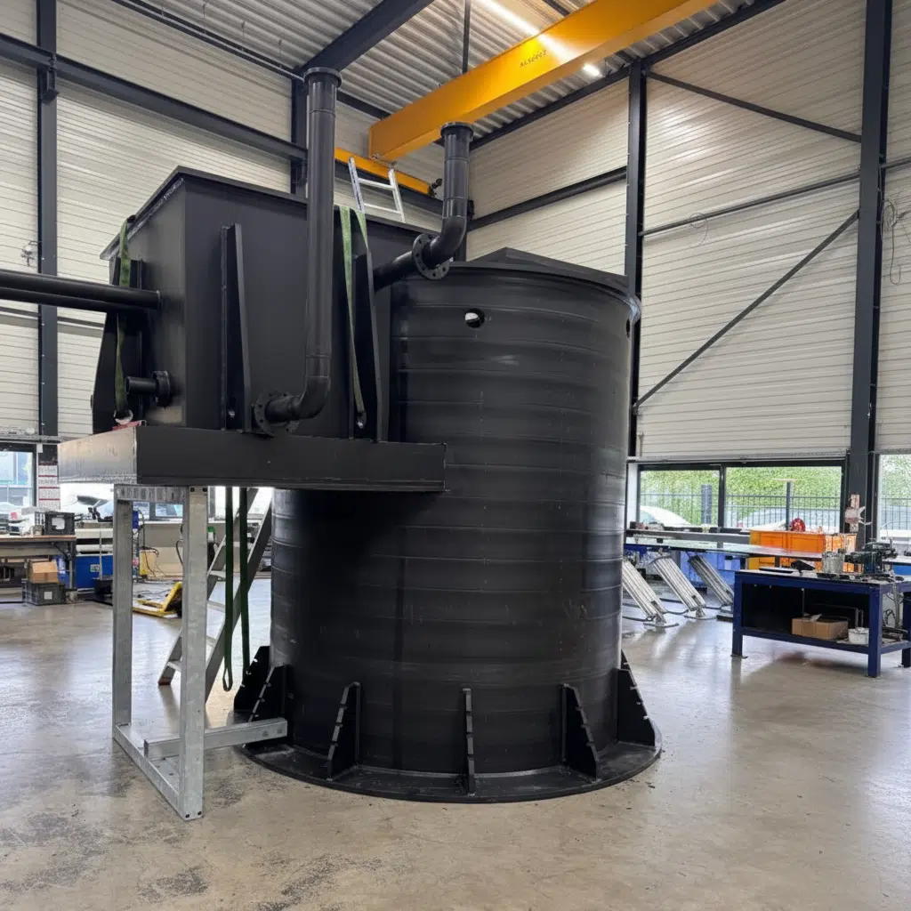 Arveon ontwikkelde in samenwerking met Altop Kunststoftechniek een unieke 2-in-1 kelder, waarbij de droge appendagekelder is geïntegreerd in een wikkelbuisput. Beide zijn uitgevoerd in HDPE, volledig bestand tegen H₂S-gas en met een verlaagde CO₂-voetafdruk dankzij gebruik van Röchling ReLoop 40/60% gerecycled HDPE. Daarnaast wordt de kelder prefab geproduceerd en kan deze als één geheel getransporteerd en geplaatst worden. Kortom: een snelle, veilige en duurzame oplossing.